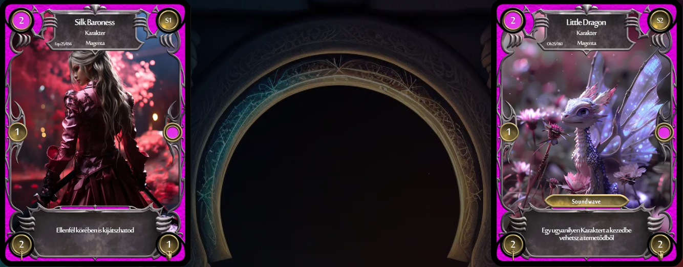 A Magenta első Kasztképessége izgalmas, nagy erőt képvisel, hiszen az ellenfél körében is játékba hozhatjuk a Karaktereinket. Így egyrészt váratlan helyzeteket teremthet, másrészt aktív Karakterekkel kezdhetjük a körünket. A második Kasztképesség pedig segít abban, hogy kevesebb Karakterrel építsük a paklit, így több helyet kaphatunk a fontosabb Varázslatoknak, amiből nem szűkölködik a kaszt.